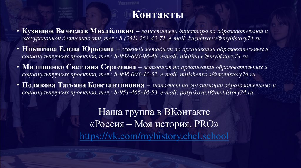 экскурсионной деятельности, тел.: 8 (351) 263-43-71, e-mail: kuznetsov.v@myhistory74.ru