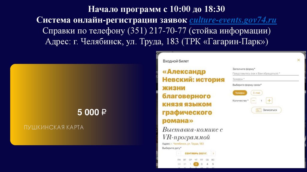 Начало программ с 10:00 до 18:30Система онлайн-регистрации заявок culture-events.gov74.ru