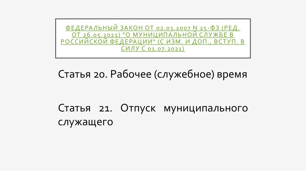 Ф Е Д Е РА ЛЬ НЫЙ З А КО Н ОТ 02. 03 .2007 N 25 - Ф З ( Р Е Д .ОТ 26 . 0 5 . 2021) " О МУ НИЦИПА ЛЬ НО Й СЛ У ЖБЕ В
