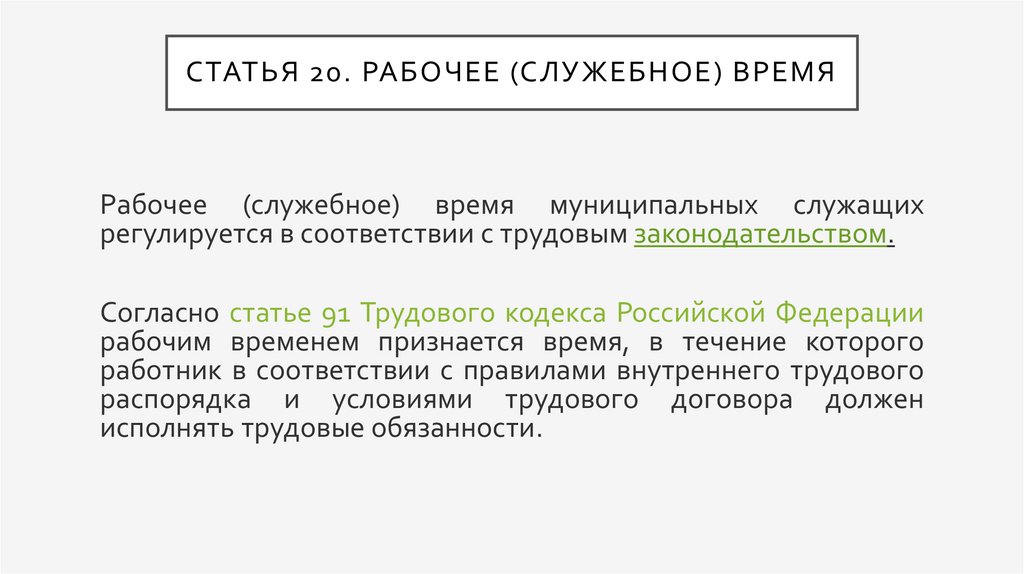 СТАТЬЯ 20. РАБОЧЕЕ (СЛУЖЕБНОЕ) ВРЕМЯРабочее (служебное) время муниципальных служащих