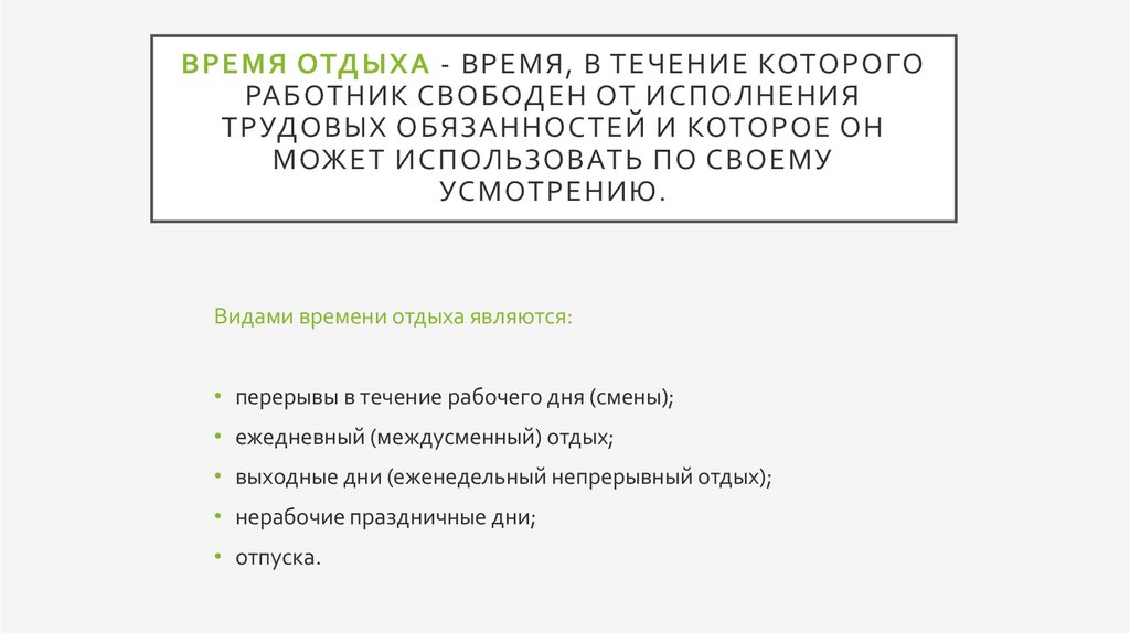 ВРЕМЯ ОТДЫХА - ВРЕМЯ, В ТЕЧЕНИЕ КОТОРОГОРАБОТНИК СВОБОДЕН ОТ ИСПОЛНЕНИЯ