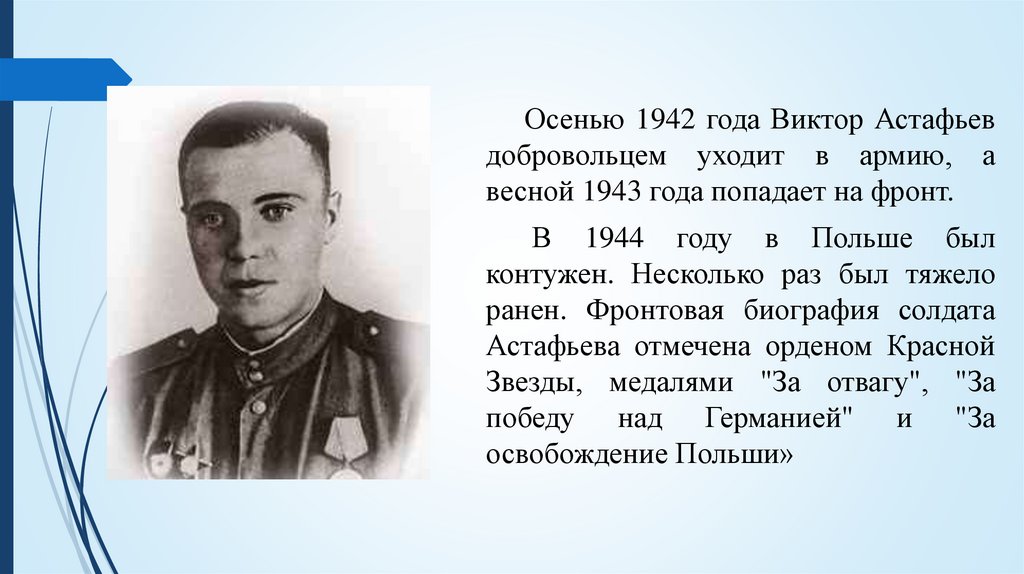 Осенью 1942 года Виктор Астафьевдобровольцем уходит в армию, а