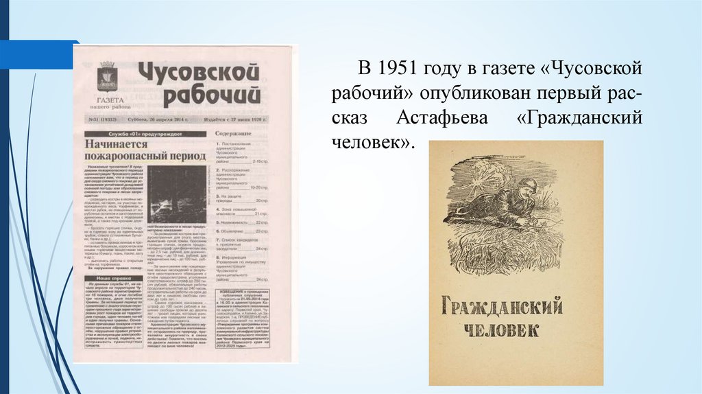 В 1951 году в газете «Чусовскойрабочий» опубликован первый рассказ Астафьева «Гражданский