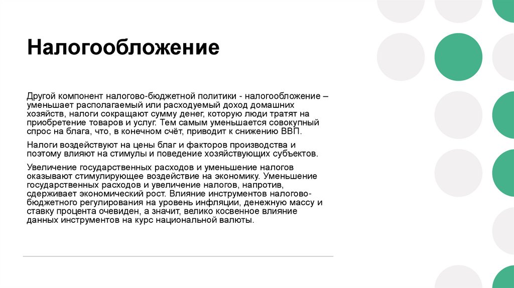 НалогообложениеДругой компонент налогово-бюджетной политики - налогообложение –