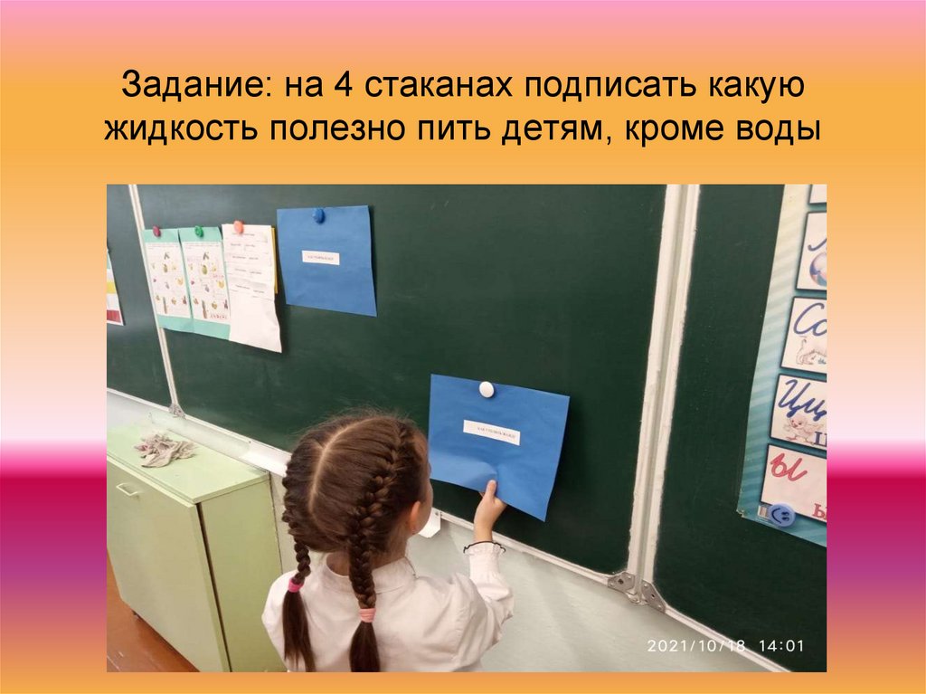 Задание: на 4 стаканах подписать какуюжидкость полезно пить детям, кроме воды