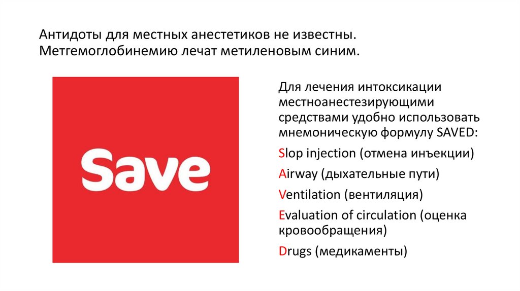 Антидоты для местных анестетиков не известны.Метгемоглобинемию лечат метиленовым синим.