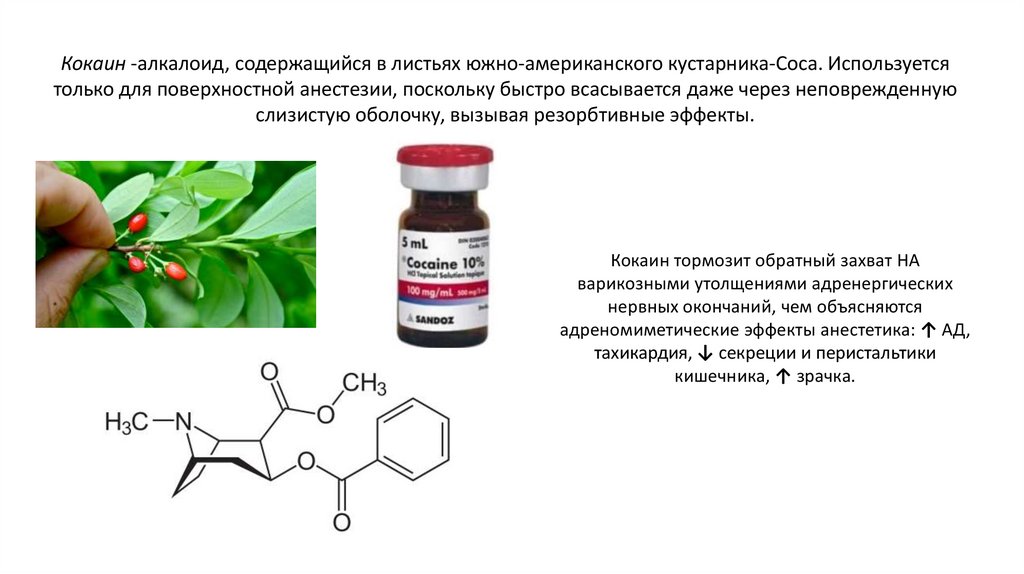 Кокаин -алкалоид, содержащийся в листьях южно-американского кустарника-Coca. Используетсятолько для поверхностной анестезии, поскольку быстро всасывается даже через неповрежденную