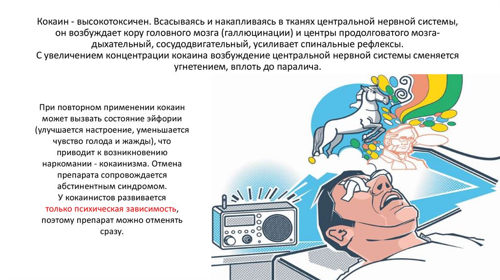 Кокаин - высокотоксичен. Всасываясь и накапливаясь в тканях центральной нервной системы,он возбуждает кору головного мозга (галлюцинации) и центры продолговатого мозгадыхательный, сосудодвигательный, усиливает спинальные рефлексы.