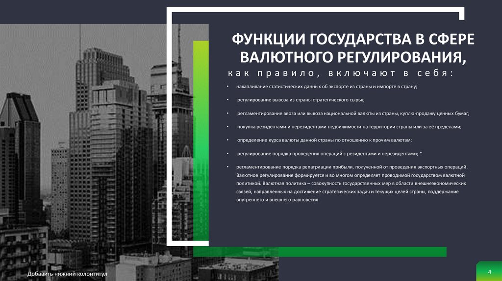регламентирование ввоза или вывоза национальной валюты из страны, куплю-продажу ценных бумаг;