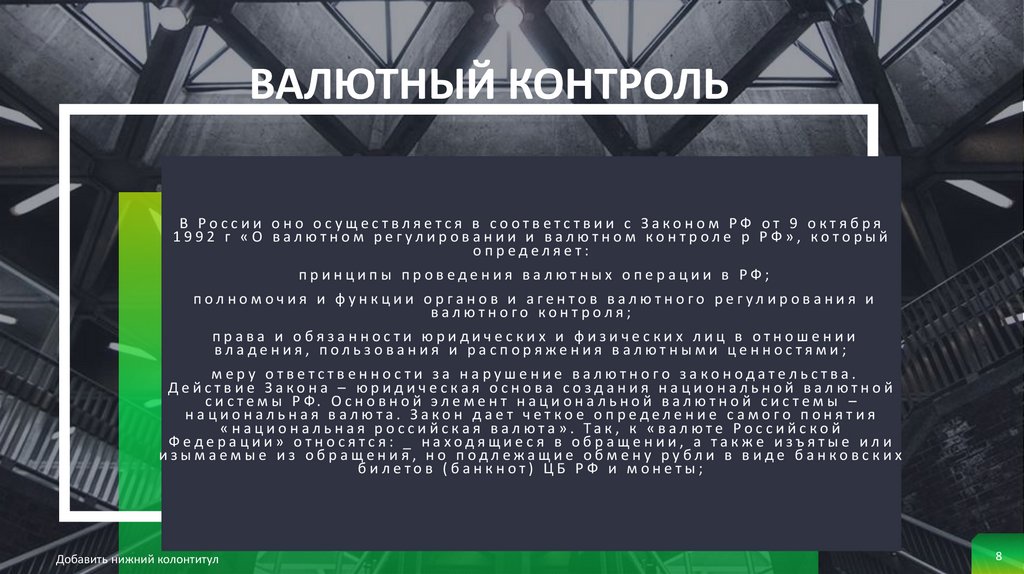 ВАЛЮТНЫЙ КОНТРОЛЬВ России оно осуществляется в соответствии с Законом РФ от 9 октября