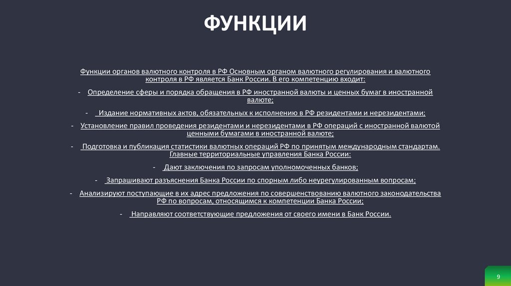 ФУНКЦИИФункции органов валютного контроля в РФ Основным органом валютного регулирования и валютного
