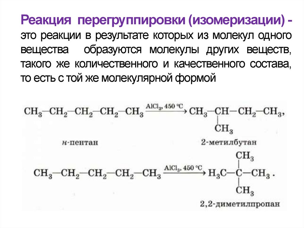 Реакция перегруппировки (изомеризации) это реакции в результате которых из молекул одноговещества образуются молекулы других веществ,