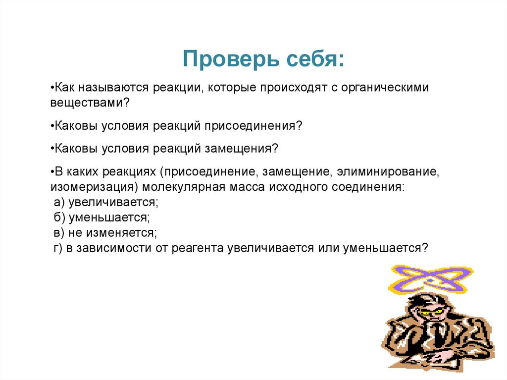 Проверь себя:•Как называются реакции, которые происходят с органическими