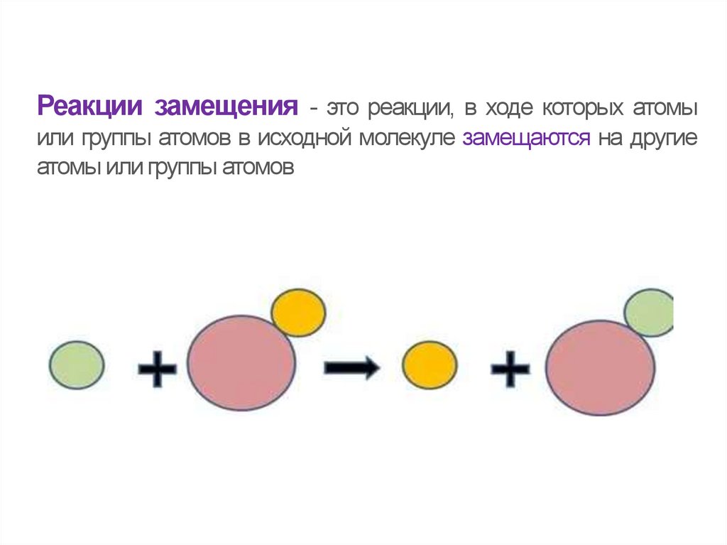 Реакции замещения - это реакции, в ходе которых атомыили группы атомов в исходной молекуле замещаются на другие