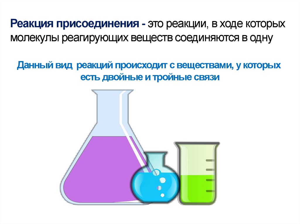 Реакция присоединения - это реакции, в ходе которыхмолекулы реагирующих веществ соединяются в одну