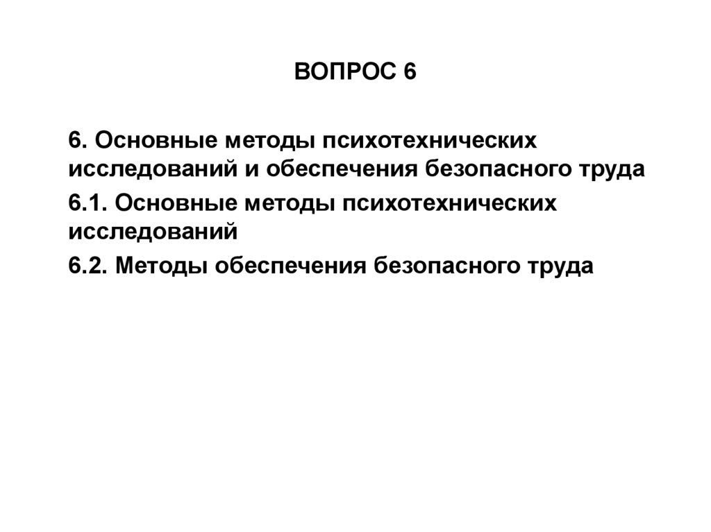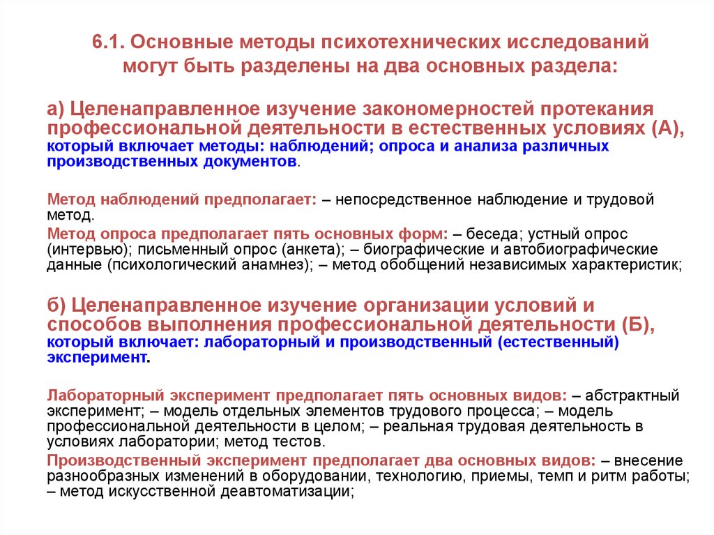 6.1. Основные методы психотехнических исследованиймогут быть разделены на два основных раздела: