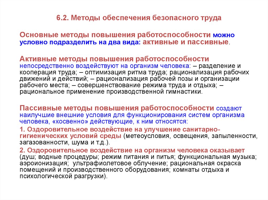 6.2. Методы обеспечения безопасного трудаОсновные методы повышения работоспособности можно