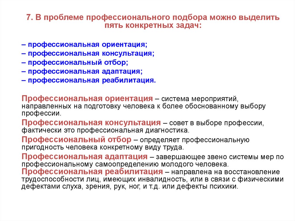 7. В проблеме профессионального подбора можно выделитьпять конкретных задач: