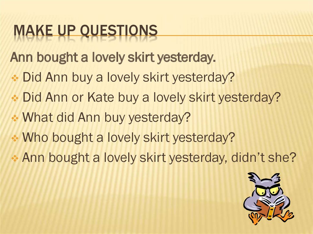 MAKE UP QUESTIONSAnn bought a lovely skirt yesterday.