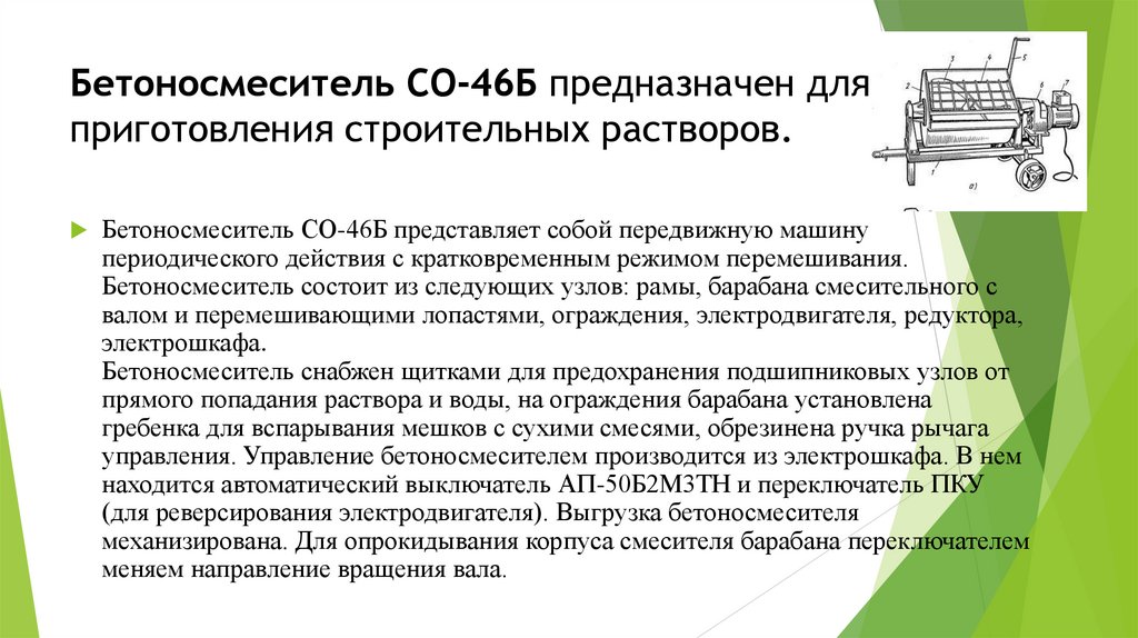 Бетоносмеситель СО-46Б предназначен дляприготовления строительных растворов.