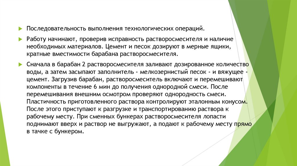 Последовательность выполнения технологических операций.Работу начинают, проверив исправность растворосмесителя и наличие