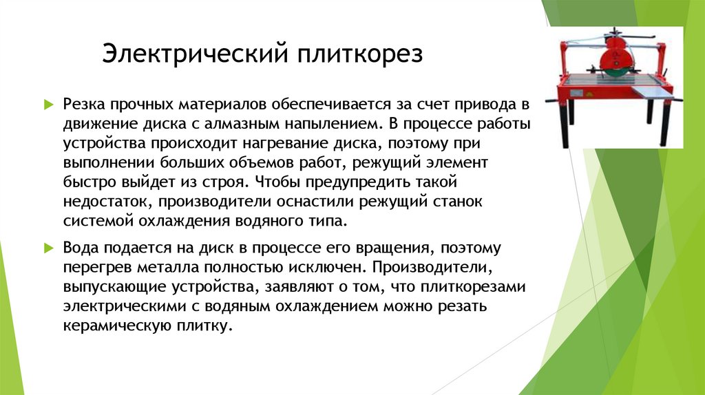 Электрический плиткорезРезка прочных материалов обеспечивается за счет привода в