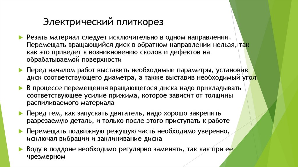 Электрический плиткорезРезать материал следует исключительно в одном направлении.