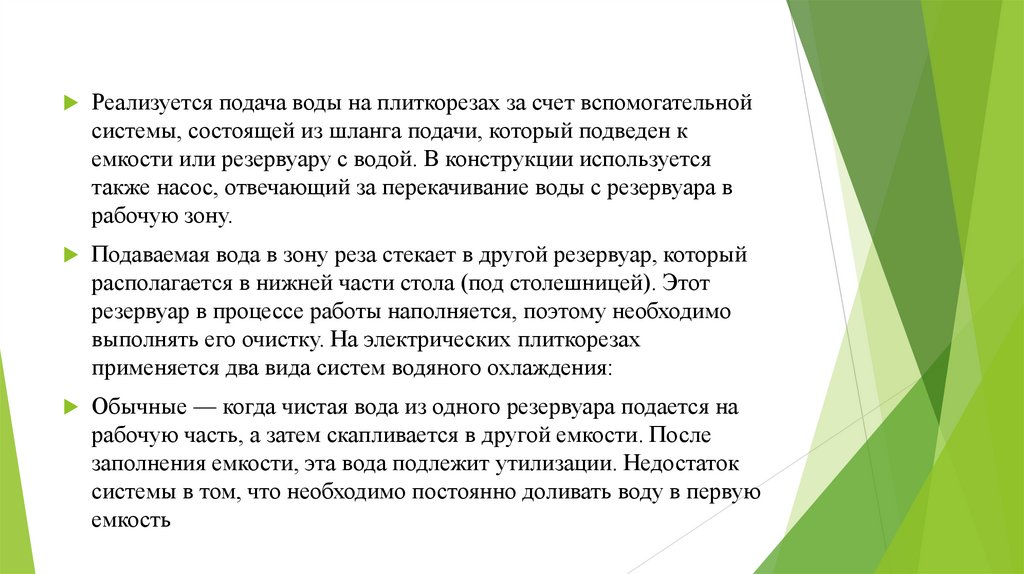 Реализуется подача воды на плиткорезах за счет вспомогательнойсистемы, состоящей из шланга подачи, который подведен к