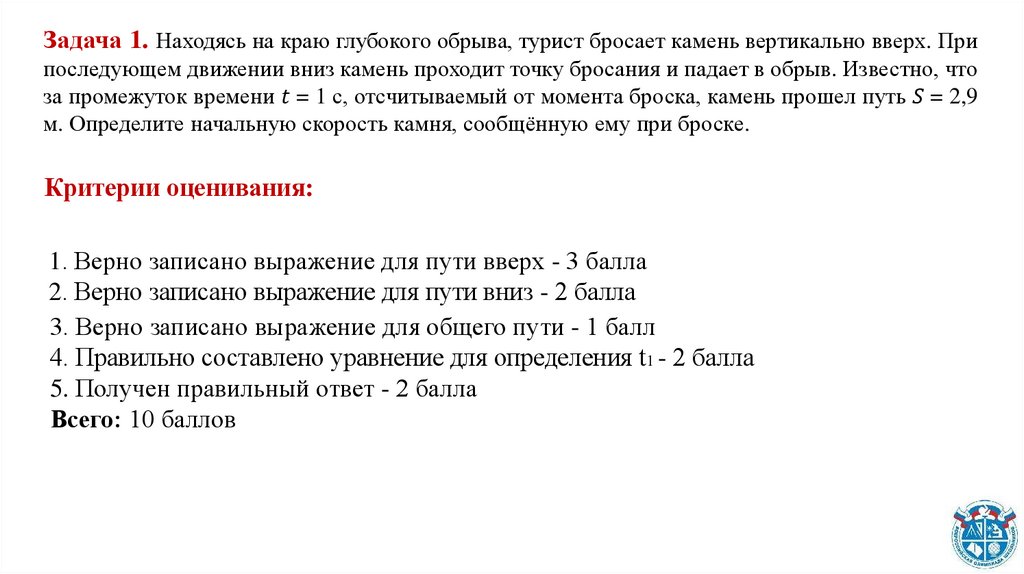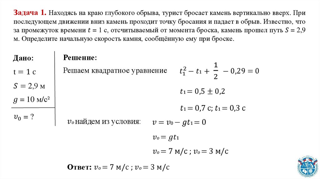 Задача 1. Находясь на краю глубокого обрыва, турист бросает камень вертикально вверх. Припоследующем движении вниз камень проходит точку бросания и падает в обрыв. Известно, что