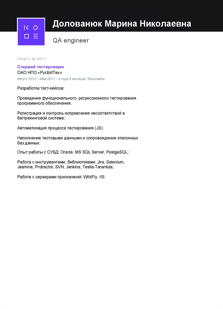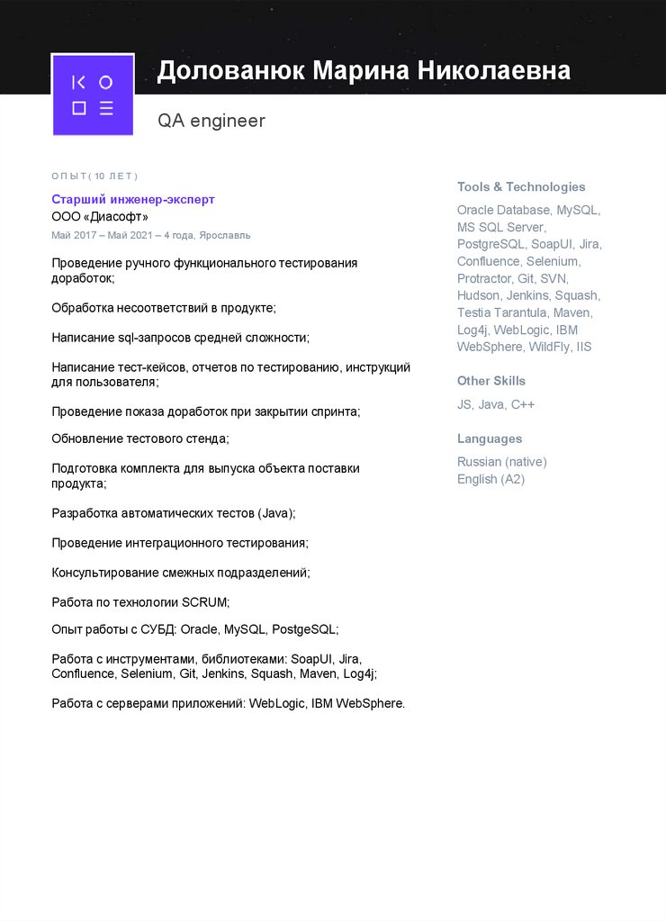 Опыт работы с СУБД: Oracle, MS SQL Server, PostgeSQL;