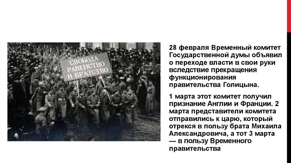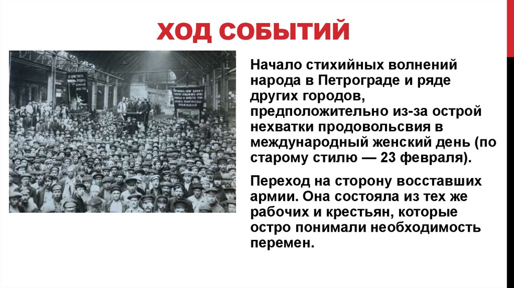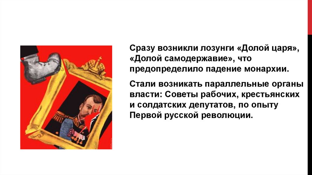 Сразу возникли лозунги «Долой царя»,«Долой самодержавие», что