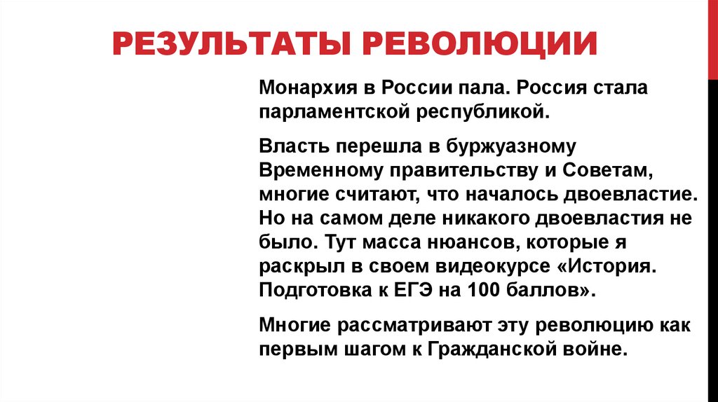 РЕЗУЛЬТАТЫ РЕВОЛЮЦИИМонархия в России пала. Россия стала