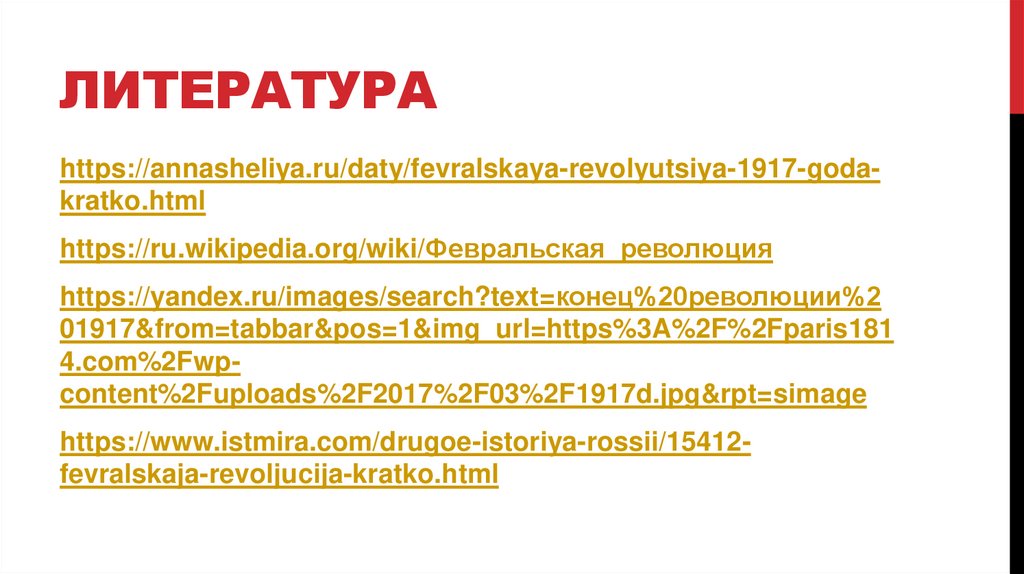 ЛИТЕРАТУРАhttps://annasheliya.ru/daty/fevralskaya-revolyutsiya-1917-godakratko.html