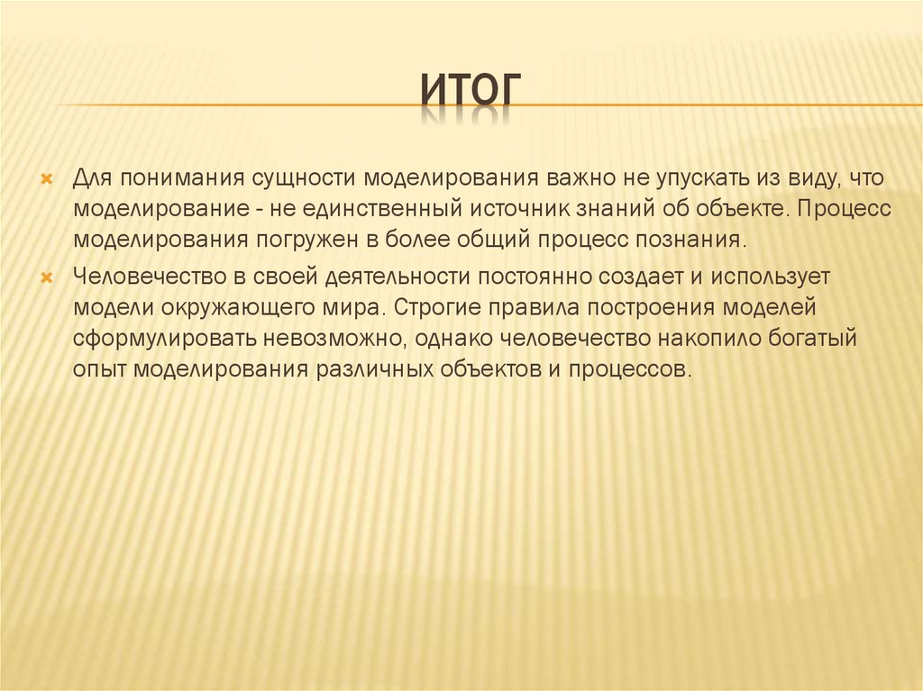 ИТОГДля понимания сущности моделирования важно не упускать из виду, что