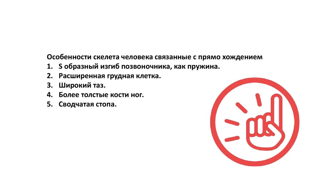 Особенности скелета человека связанные с прямо хождением1. S образный изгиб позвоночника, как пружина.