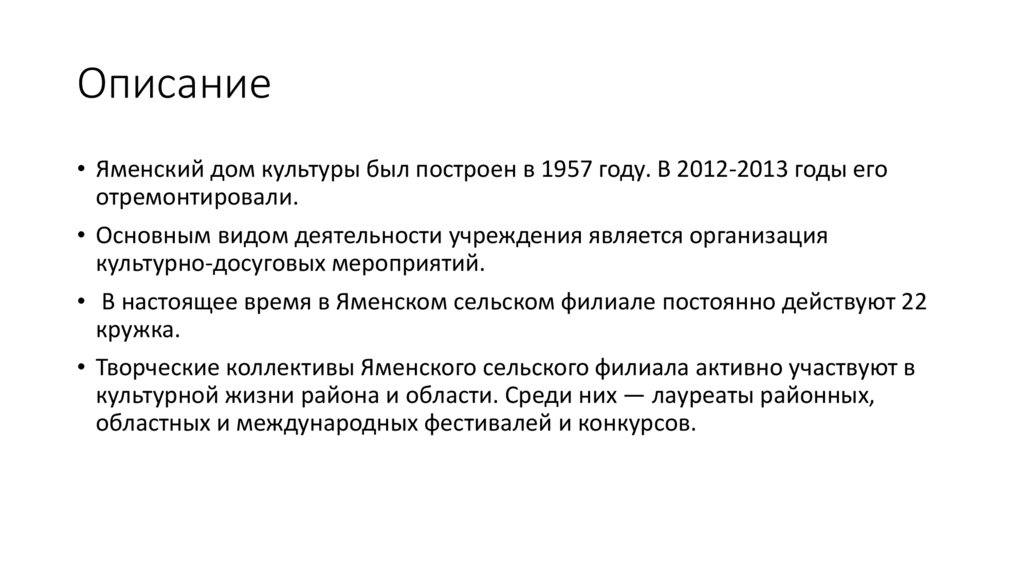 Описание• Яменский дом культуры был построен в 1957 году. В 2012-2013 годы его