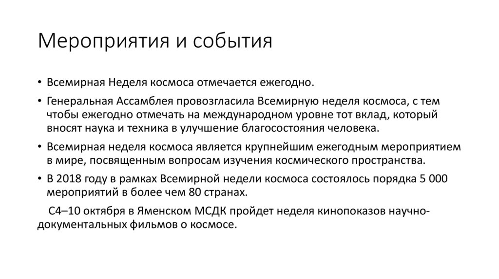 Мероприятия и события• Всемирная Неделя космоса отмечается ежегодно.