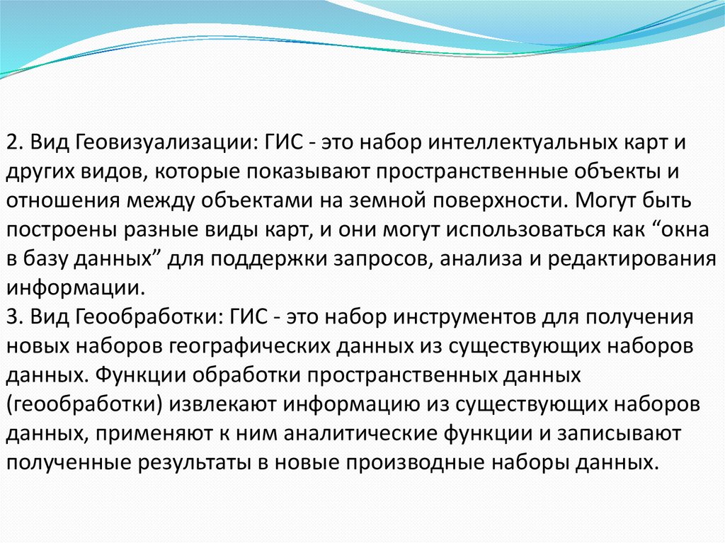 2. Вид Геовизуализации: ГИС - это набор интеллектуальных карт идругих видов, которые показывают пространственные объекты и
