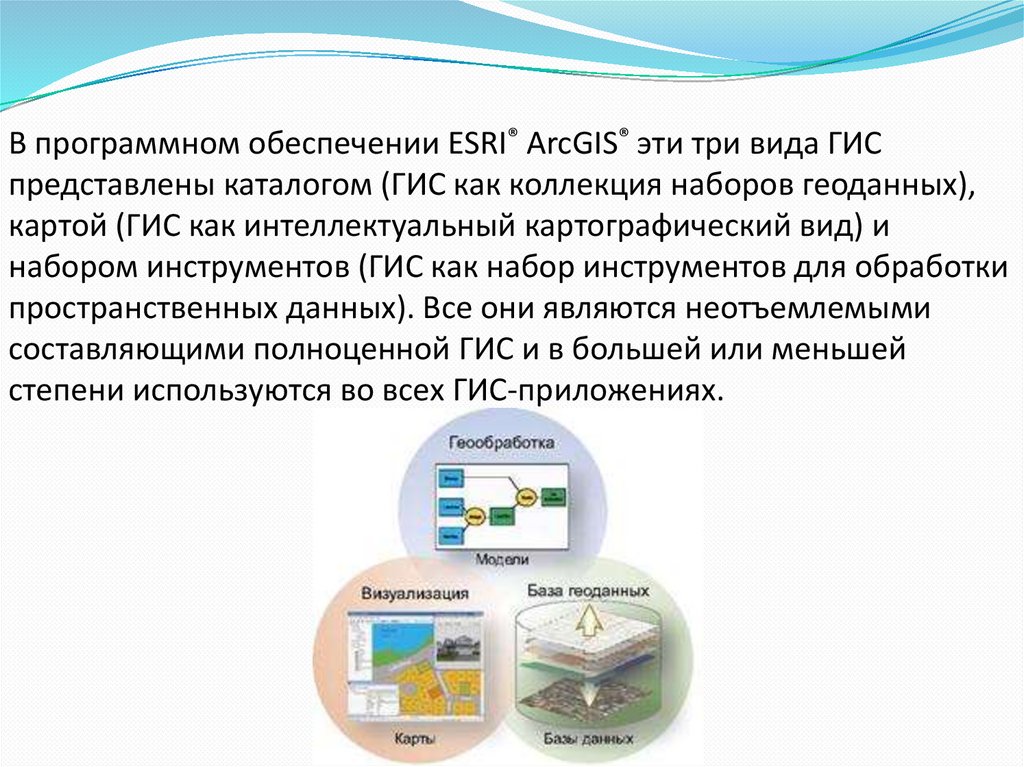 В программном обеспечении ESRI® ArcGIS® эти три вида ГИСпредставлены каталогом (ГИС как коллекция наборов геоданных),