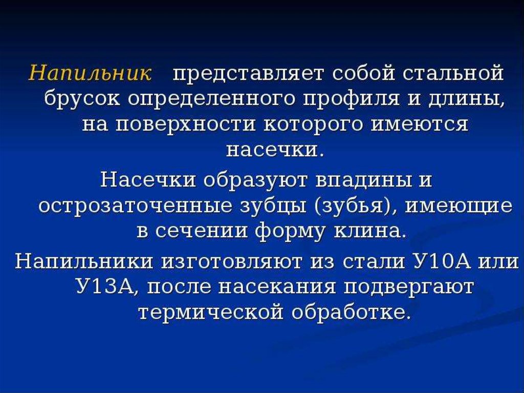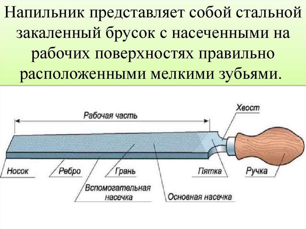 Напильник представляет собой стальнойзакаленный брусок с насеченными на