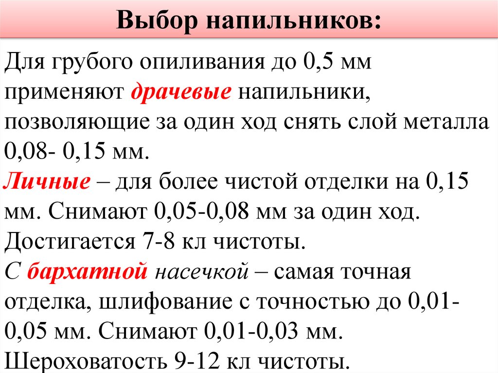 Выбор напильников:Для грубого опиливания до 0,5 мм