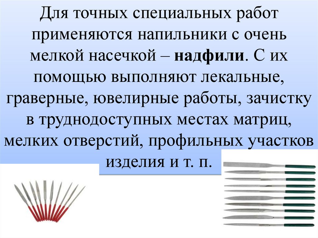 Для точных специальных работприменяются напильники с очень