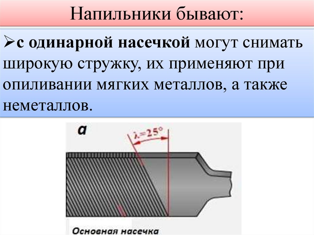 Напильники бывают:с одинарной насечкой могут снимать