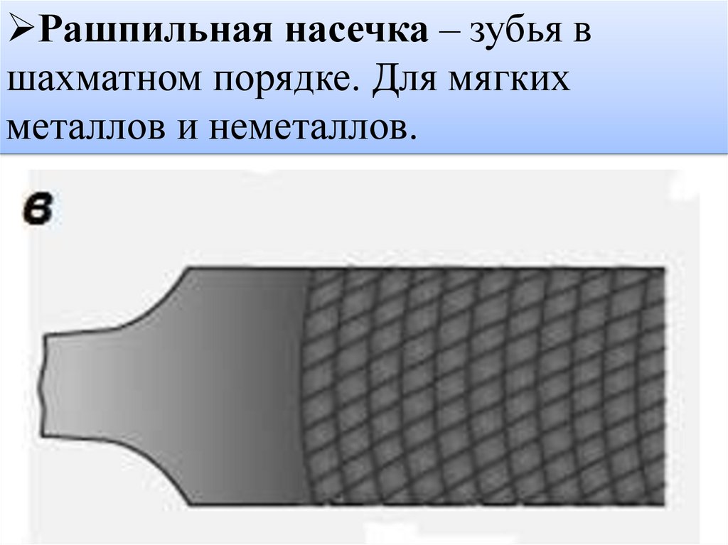 Рашпильная насечка – зубья вшахматном порядке. Для мягких