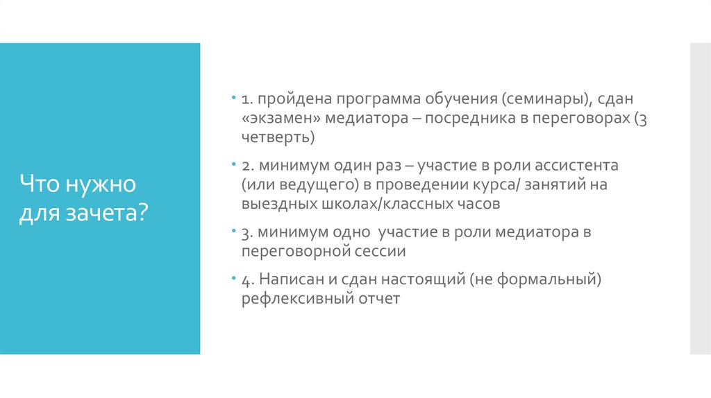 1. пройдена программа обучения (семинары), сдан«экзамен» медиатора – посредника в переговорах (3
