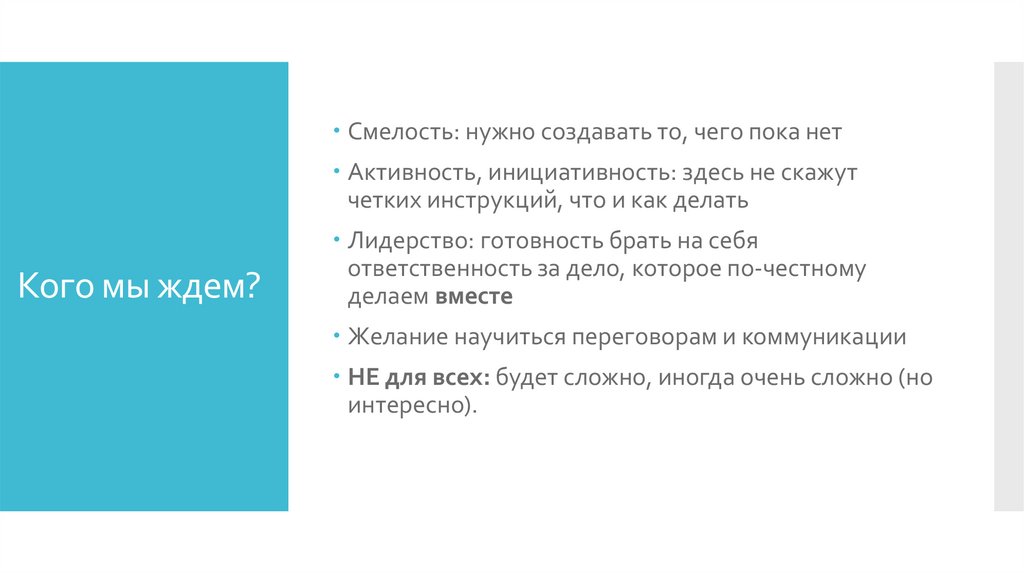 Смелость: нужно создавать то, чего пока нетАктивность, инициативность: здесь не скажут