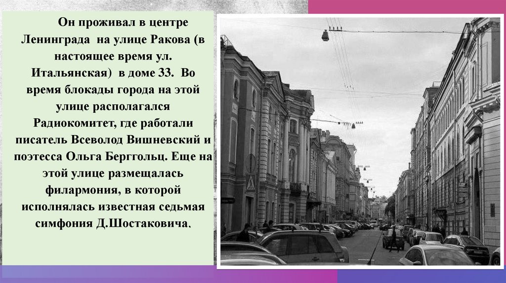 Он проживал в центреЛенинграда на улице Ракова (в