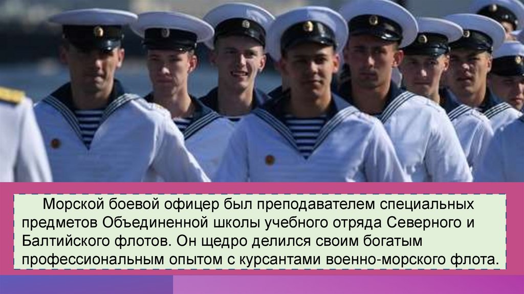 Морской боевой офицер был преподавателем специальныхпредметов Объединенной школы учебного отряда Северного и
