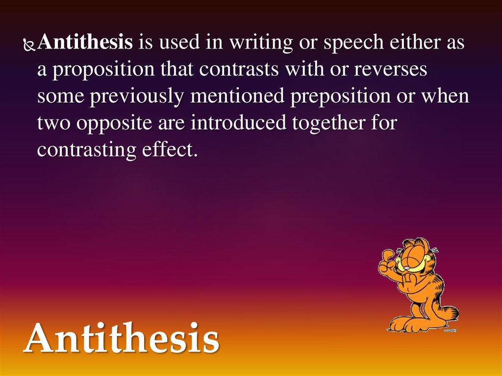 Antithesis is used in writing or speech either asa proposition that contrasts with or reverses