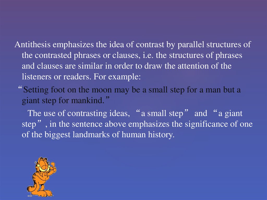 Antithesis emphasizes the idea of contrast by parallel structures ofthe contrasted phrases or clauses, i.e. the structures of phrases